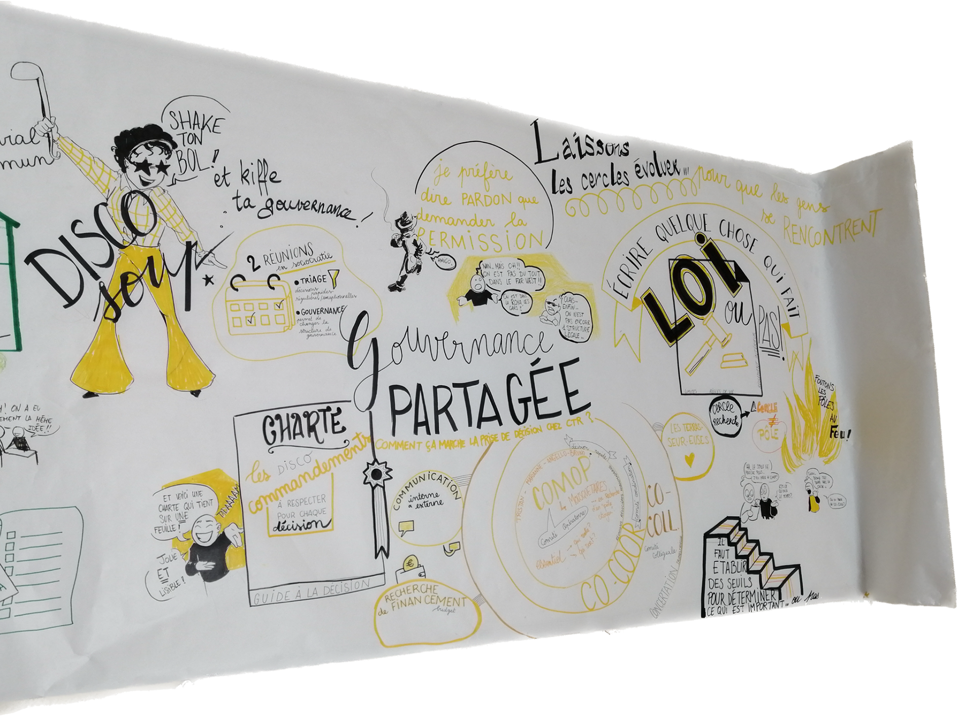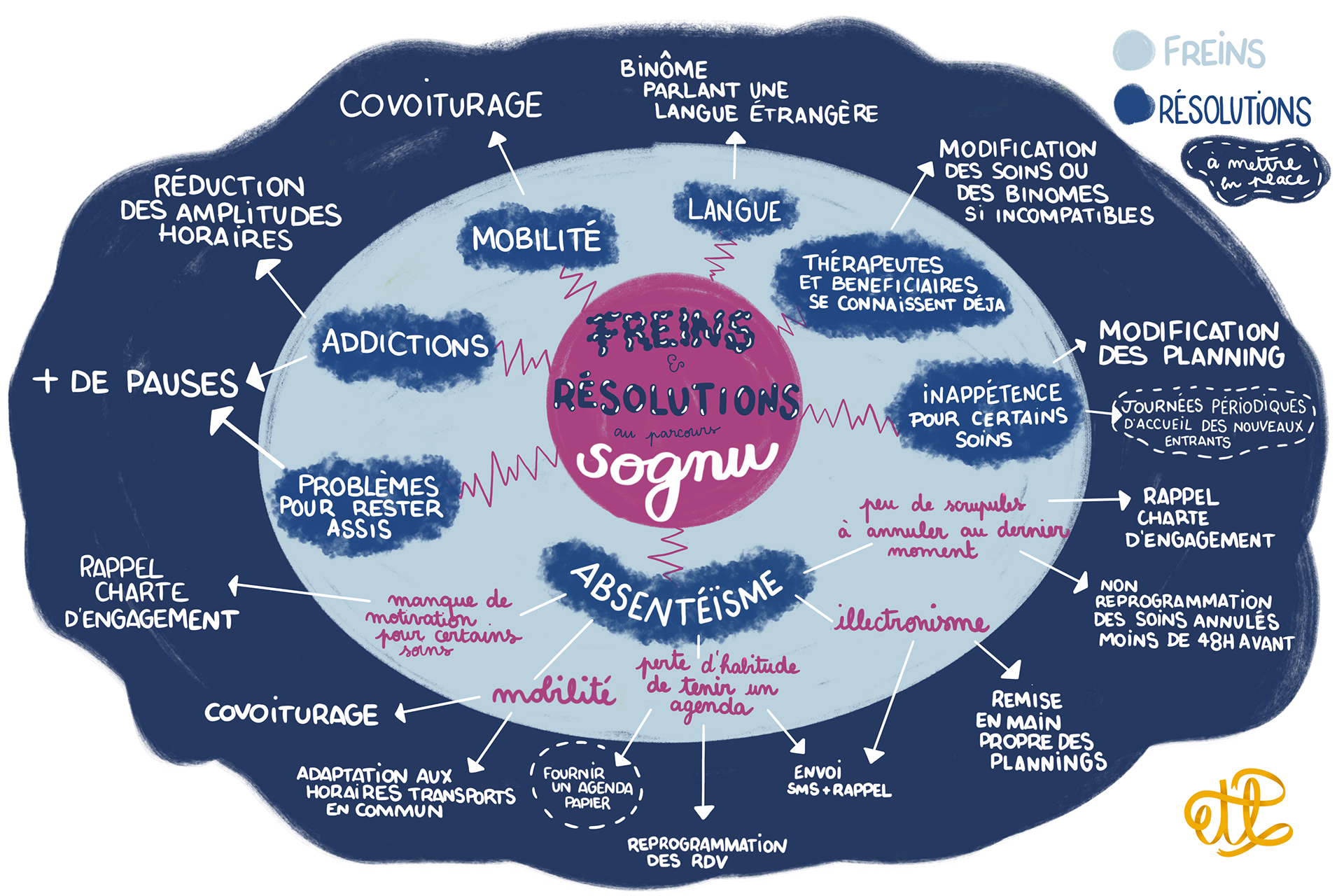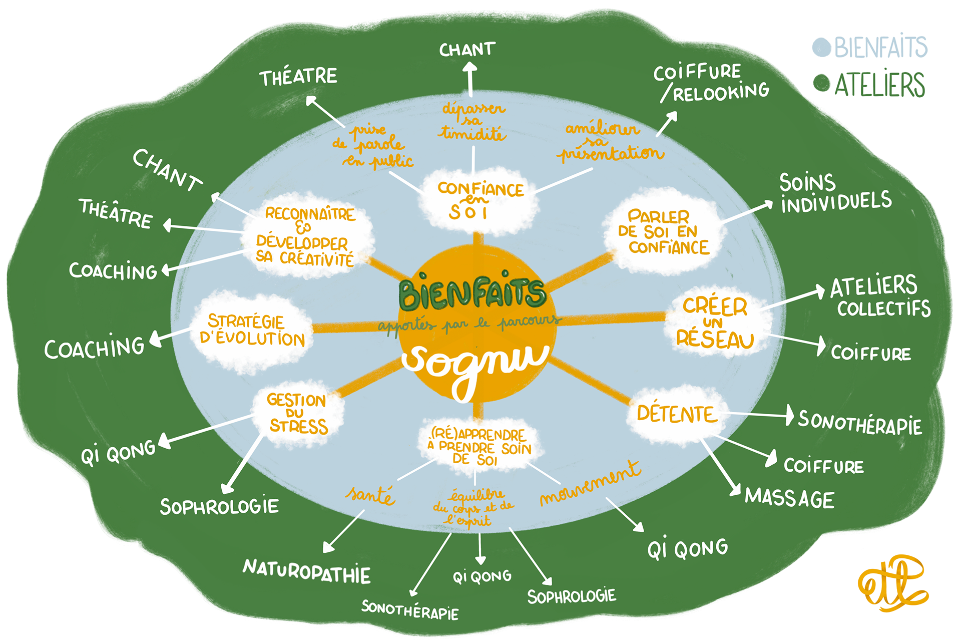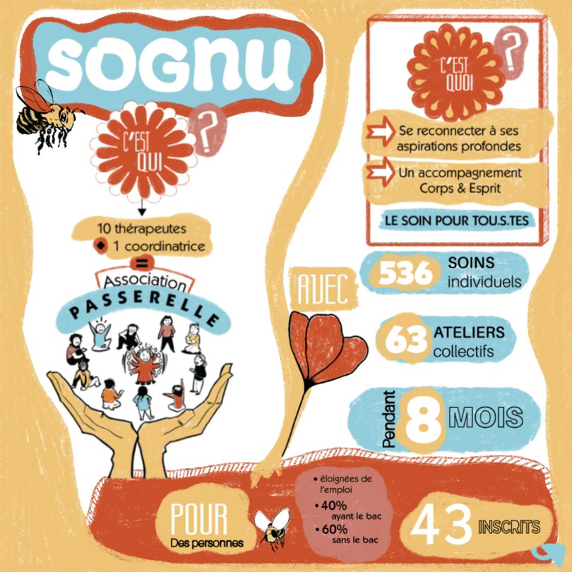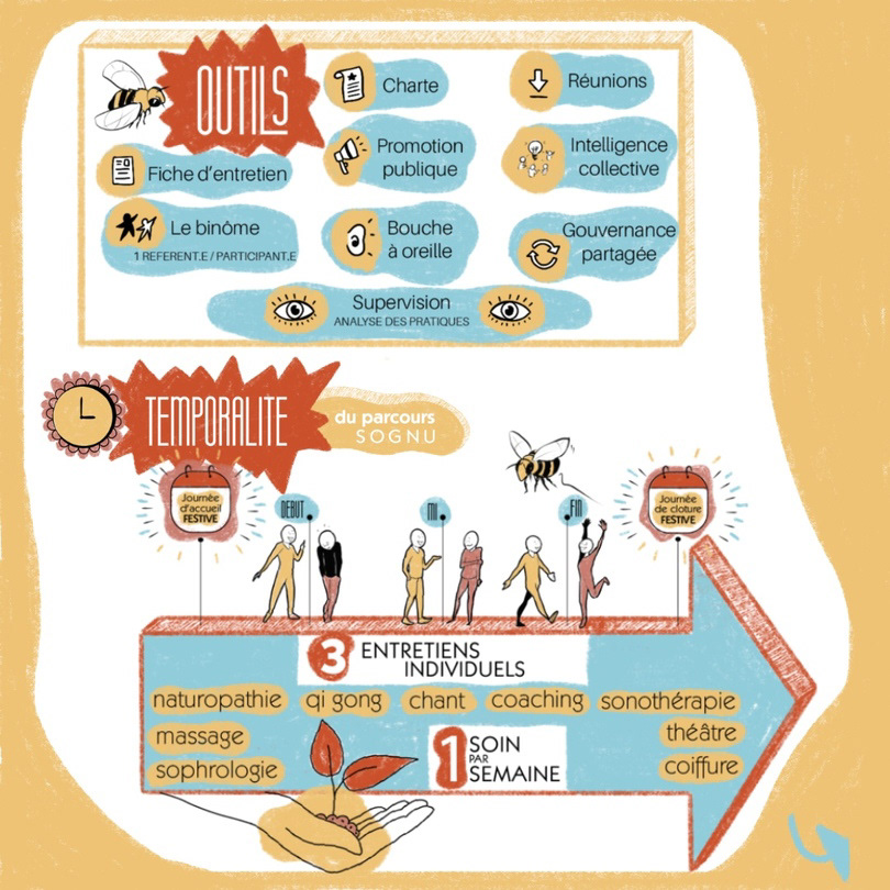 Ci-dessous le résultat d'une collaboration avec Morgane Ganault avec l'association Les Nouvelles Imaginaires. Une facilitation graphique faite pour expliqué le parcours Sognu.
