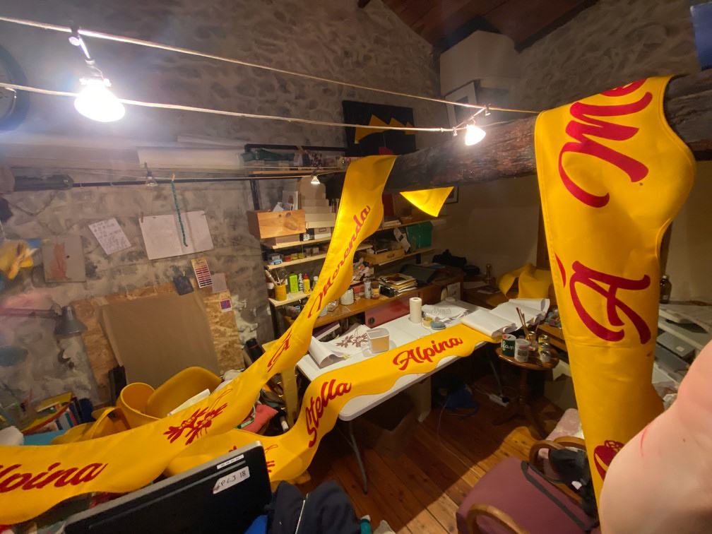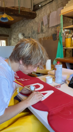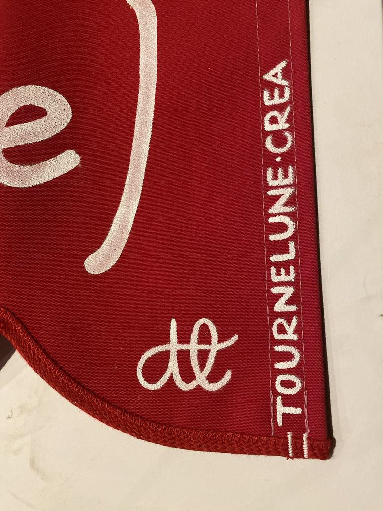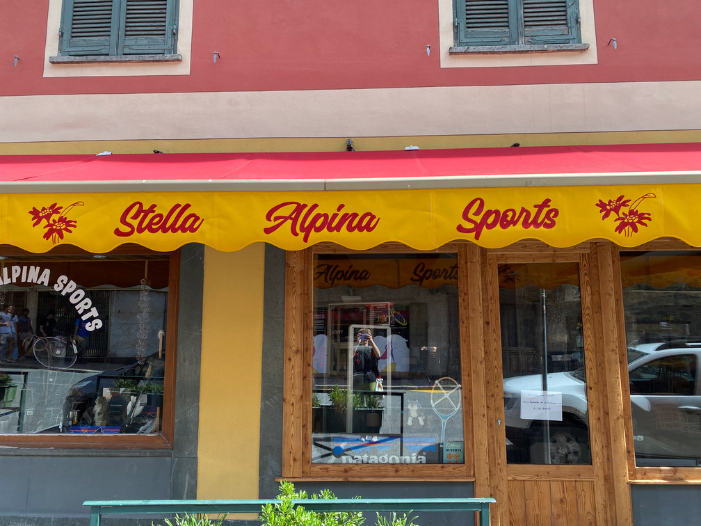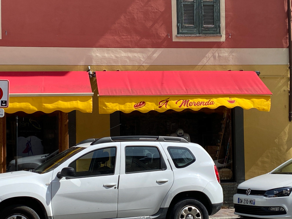 Lettres blanches peintes sur un lambrequin de 4,80m pour un commerce vivant dans la Roya.