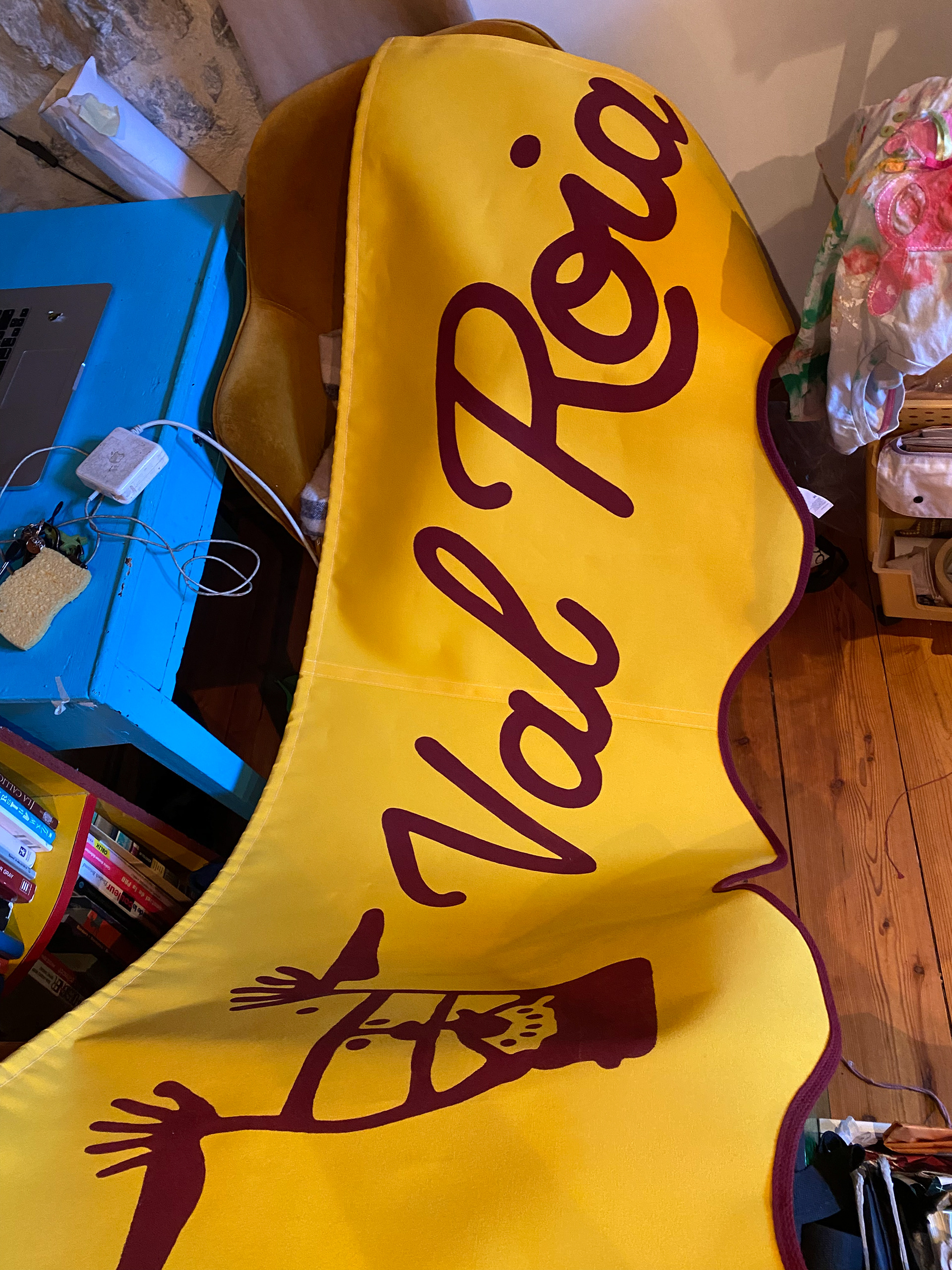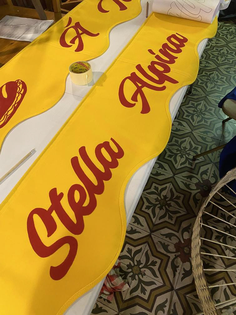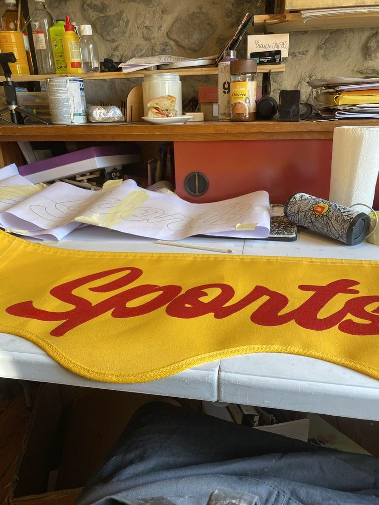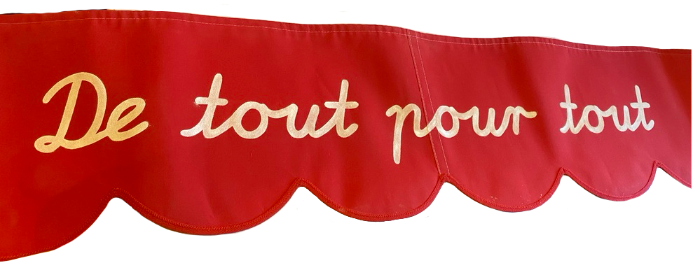 Lettres Rouge peintes sur fond jaune sur 3 lambrequins avec logo du commerce + 2 pictos